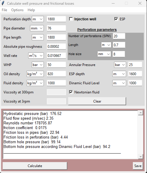 In this script, the Darcy-Weisbach formula is used to calculate these losses. The script calculates the downhole pressure, taking into account the friction losses in the tubing and the perforating interval.